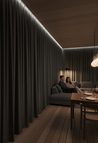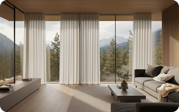 Options may include sheer and blackout curtains, ambient lighting, smart entry, climate control, and integrated storage solutions based on your resort package.