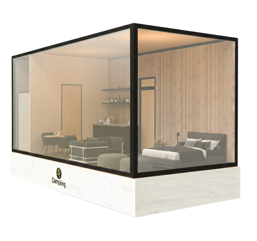 The cabin features mirror-glass façade panels, a robust structural framework, and durable interior finishes designed for long-term hospitality performance.